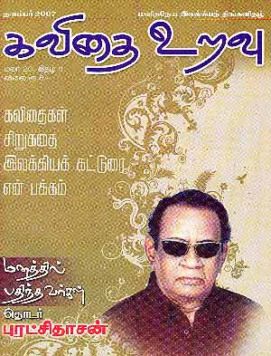 கவிதை உறவு: கவிதைக்காக ஏர்வாடி இராதாகிருட்டிணன் அவர்களை ஆசிரியராகக் கொண்டு 17 ஆண்களாக வெளிவருகிற இதழ். அட்டையில் இருப்பவர் காந்தளக அதிபர். இதழின் தொடர்பாகக் கவிதை அரங்குகளை நிகழ்த்துவதோடு தொடர்ந்து இதழை வெளியிடுகிற இதழ் இது தொடர்புக்கு : pollachinasan@gmail.com - 9788552061, |